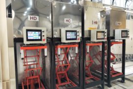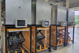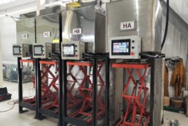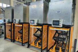 規格介紹: 1.加熱室:SS41鋼板及陶瓷纖維組成 2.使用溫度:1200℃以下 3.使用空間:φ300*H300mm,φ500*H400mm 4.發熱體:SIC加熱器 5.使用電力:220/380V 35~80KW PS:使用空間可客制化設計 特色說明: 1.可搭配AMS2750規格設計,適用於航太產業 2.使用溫控模組+SCR控制,溫控精度±1℃ 3.常壓設計,可於1200℃以下,7秒內快速取件 4.遠端模式控制台車升降